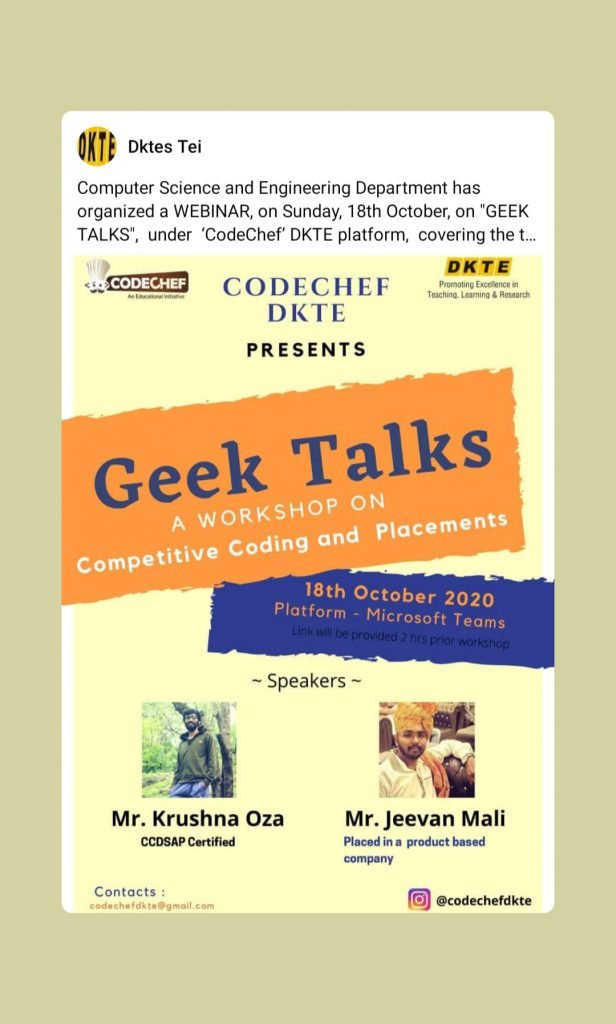 Computer Science and Engineering Department have organized a WEBINAR, on Sunday, 18th October, on “GEEK TALKS”, under ‘CodeChef’ DKTE platform, covering the topics like – Competitive Programming and Placements. We have 2 extremely spectacular speakers contributing to the webinar: 1. Mr. Krushna Oza (CCDSAP Certified)2. Mr. Jeevan Mali (Placed in a product-based company) This webinar […]